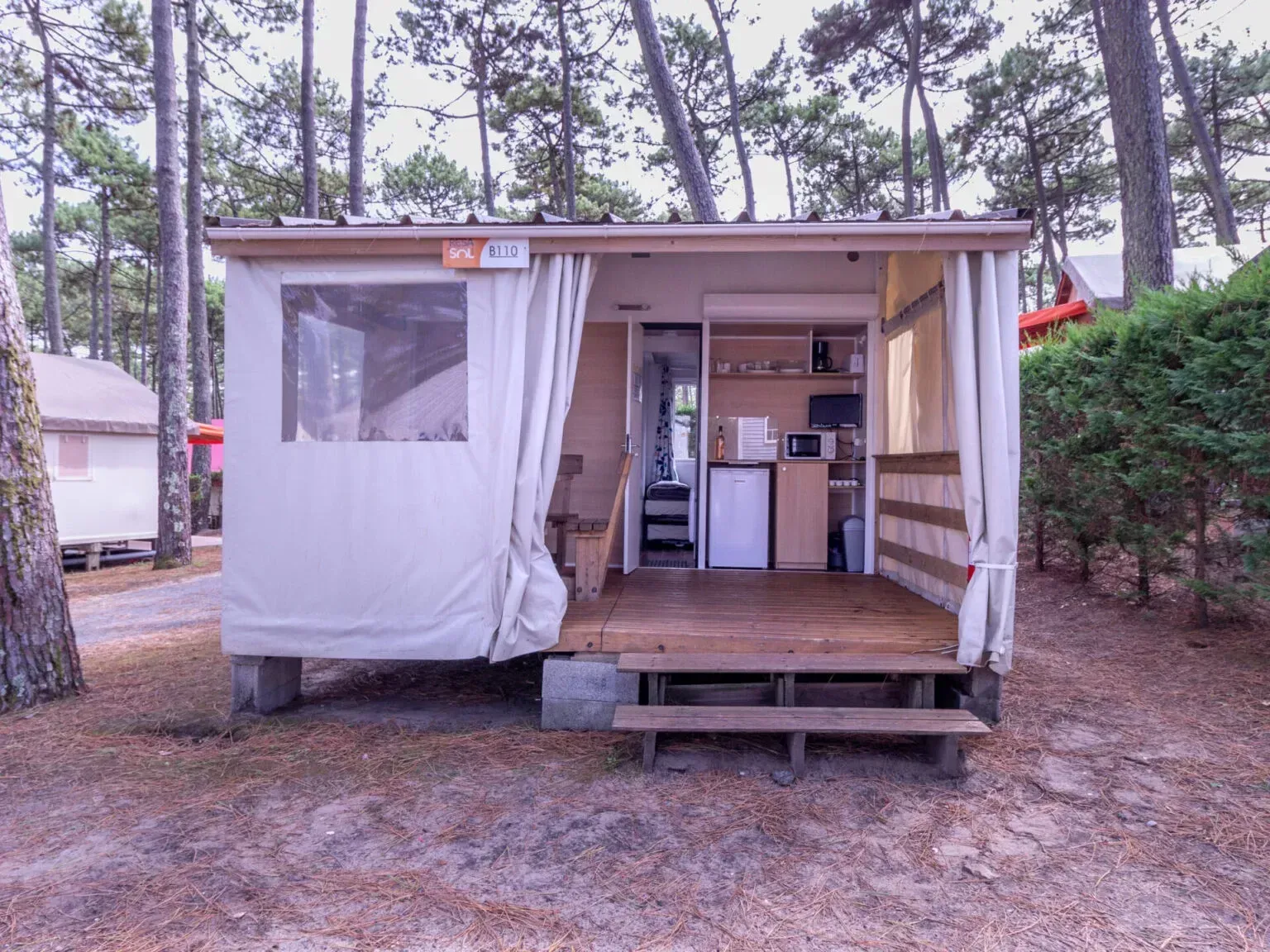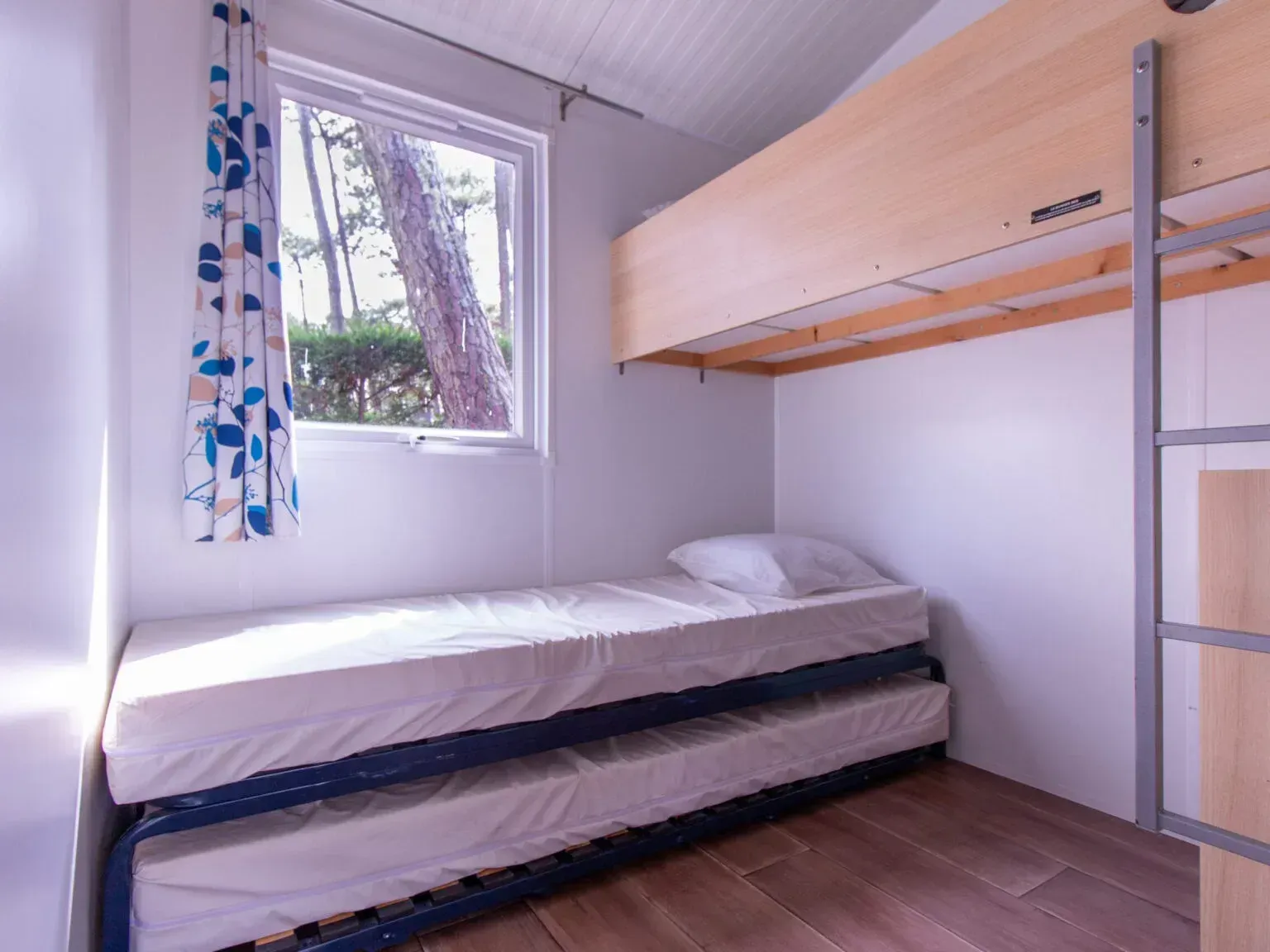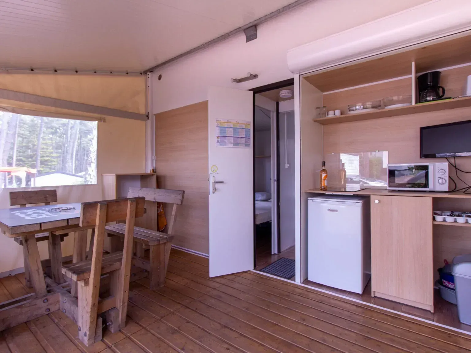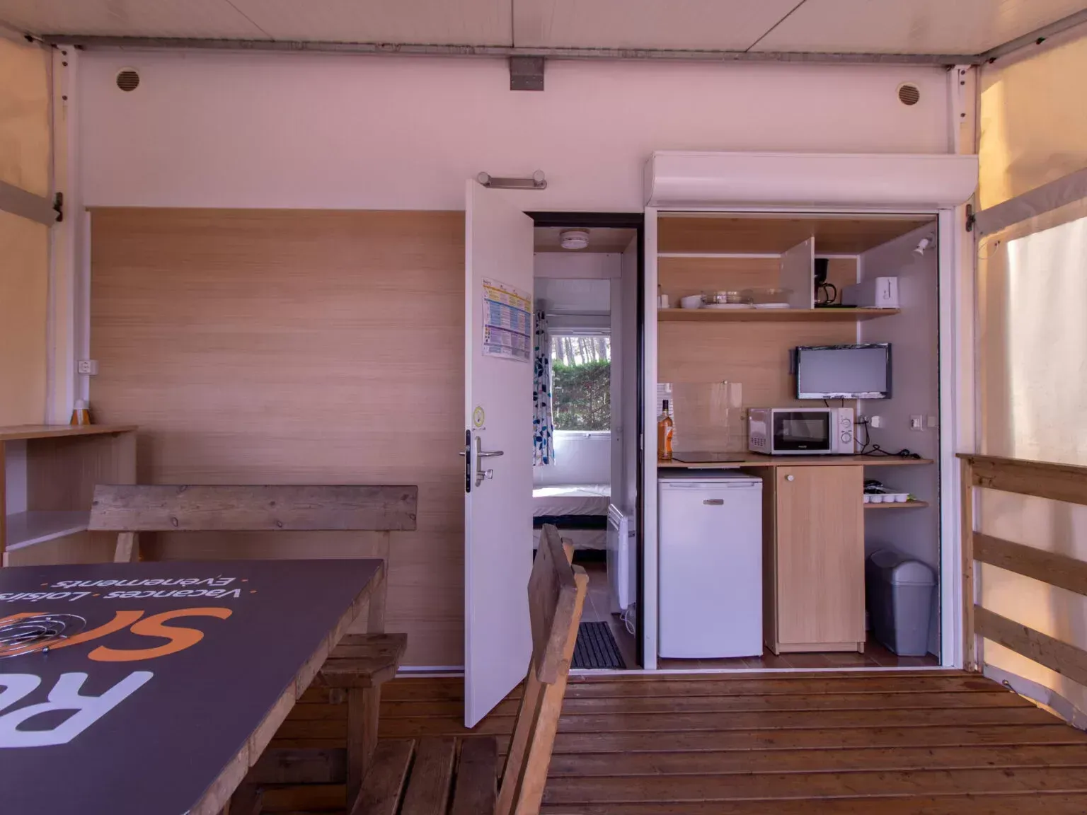 - 2 dormitorios de 5 plazas. - 1 punto de calor eléctrico. - Cocina equipada con: o Placa eléctrica de dos fuegos. o Microondas. o Nevera con congelador. - 5,50X4,25 metros. - Exteriores de PVC con cristal climalit en puetas y ventanas. - Transporte incluido en La Comunidad de Madrid.